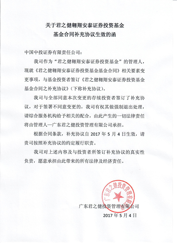 关于君之健翱翔安泰证券投资基金基金合同补充协议生效的函
