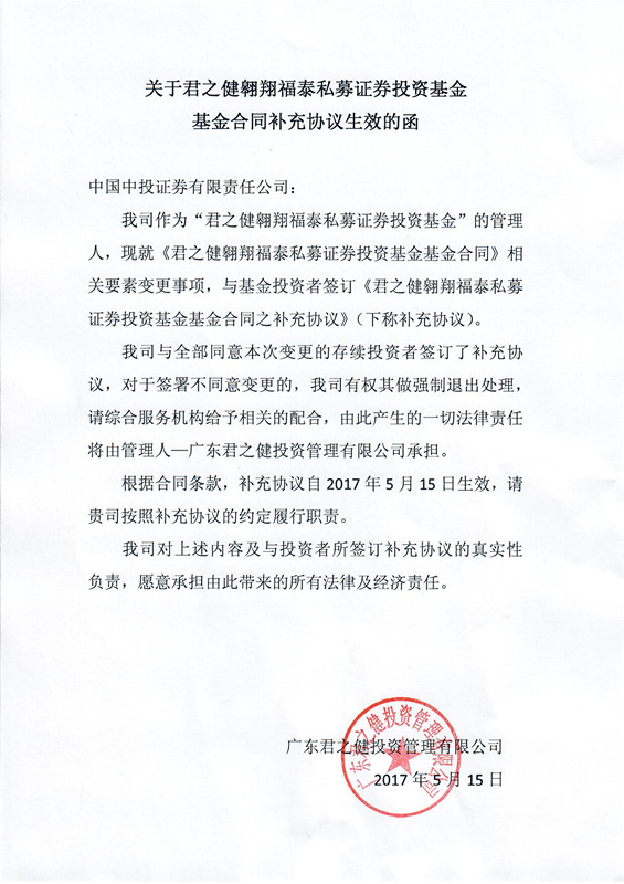 关于君之健翱翔福泰私募证券投资基金基金合同补充协议生效的函