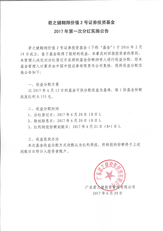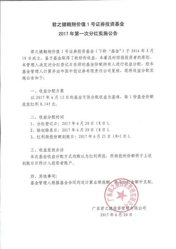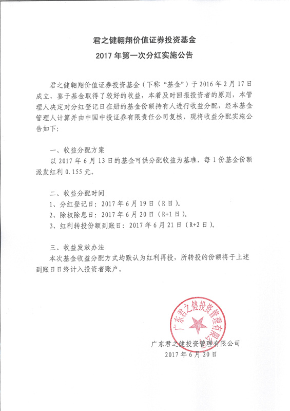 君之健翱翔价值系列证券投资基金2017年第1次分红实施公告