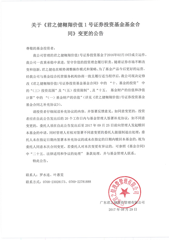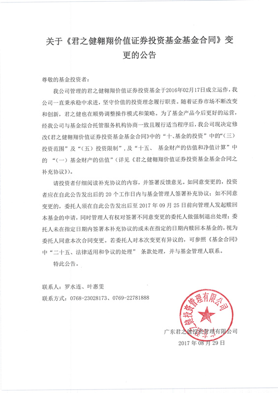 一、根据君之健翱翔价值证券投资基金(以下简称“本基金”)基金合同第二十二章“基金合同的变更、终止”的约定,对本基金的合同条款进行以下变更。
