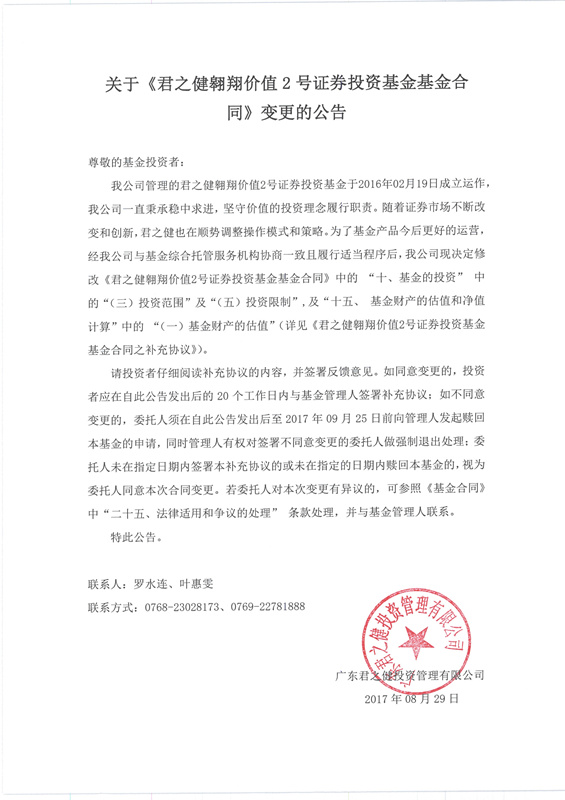 一、根据君之健翱翔价值2号证券投资基金 (以下简称“本基金”)基金合同第二十二章“基金合同的变更、终止”的约定,对本基金的合同条款进行以下变更。