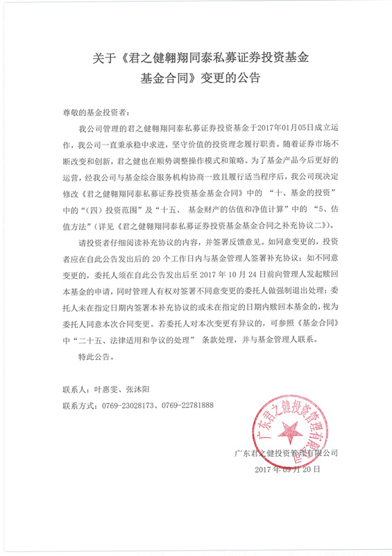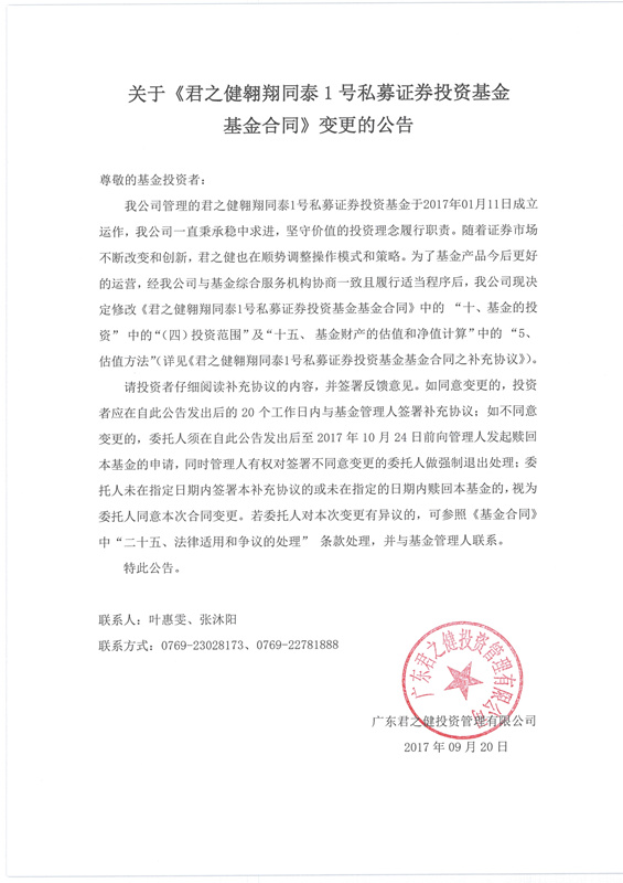 一、根据君之健翱翔同泰1号私募证券投资基金(以下简称“本基金”)基金合同第二十二章“基金合同的变更、终止”的约定,对本基金的合同条款进行以下变更。
