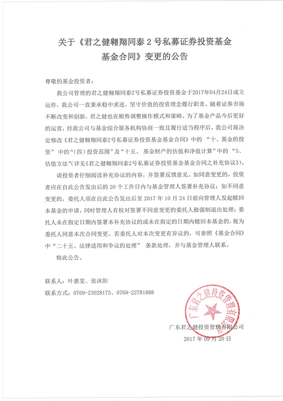 一、根据君之健翱翔同泰2号私募证券投资基金(以下简称“本基金”)基金合同第二十二章“基金合同的变更、终止”的约定,对本基金的合同条款进行以下变更。