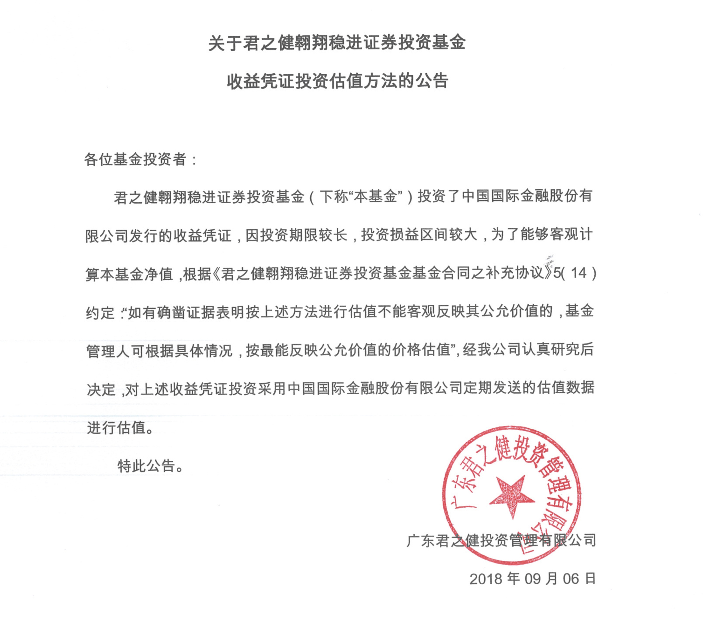 关于君之健翱翔稳进证券投资基金收益凭证估值方法的公告