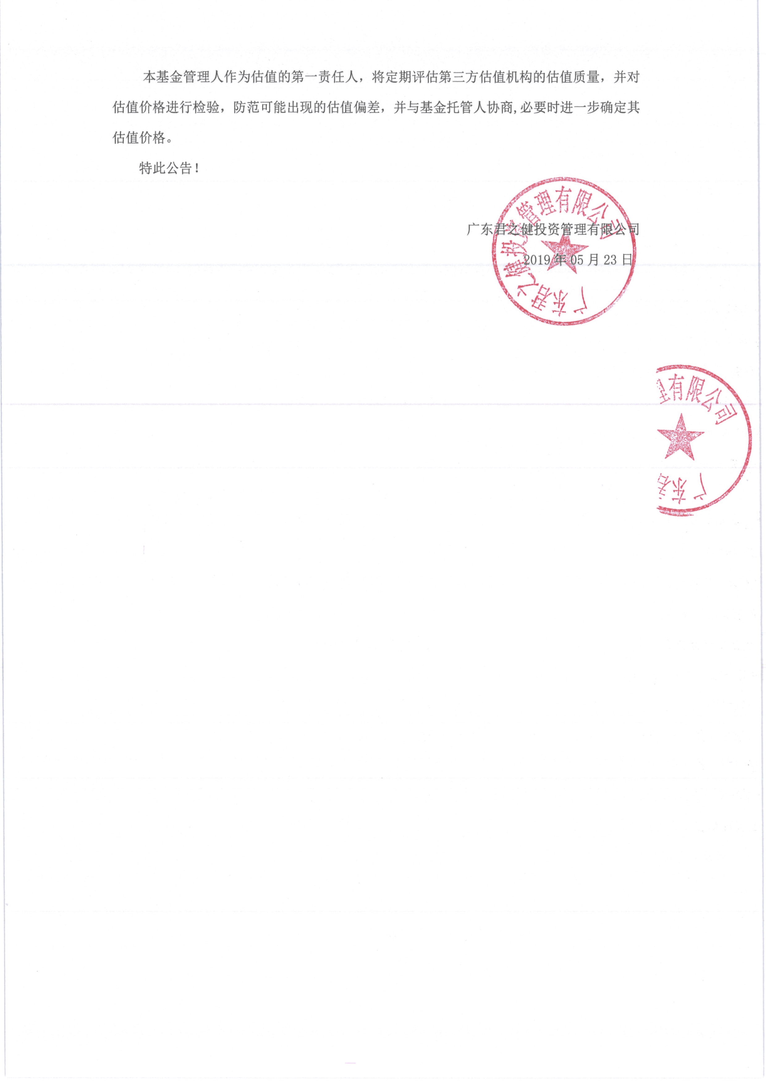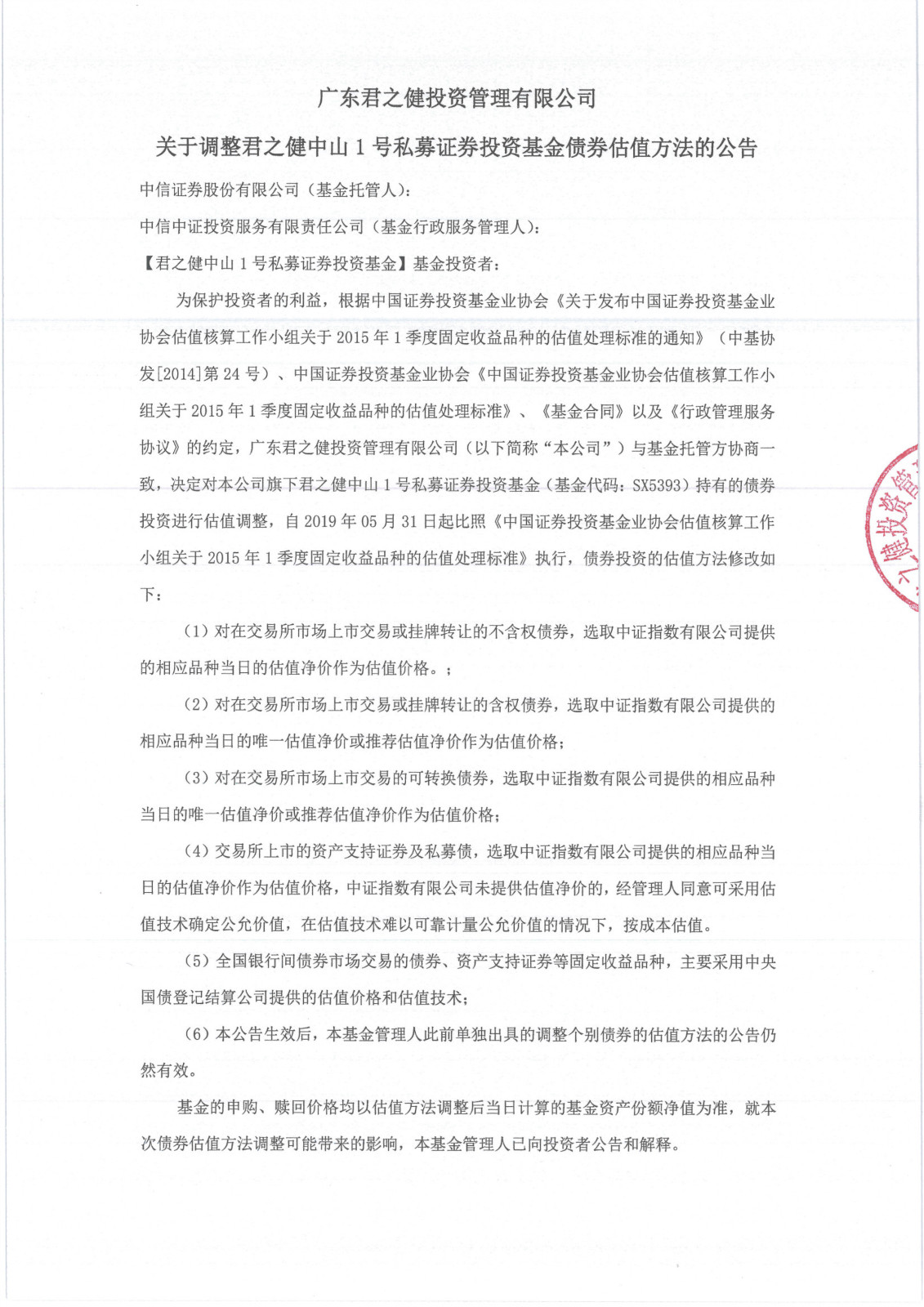 关于调整君之健中山1号私募证券投资基金债券估值方法的公告