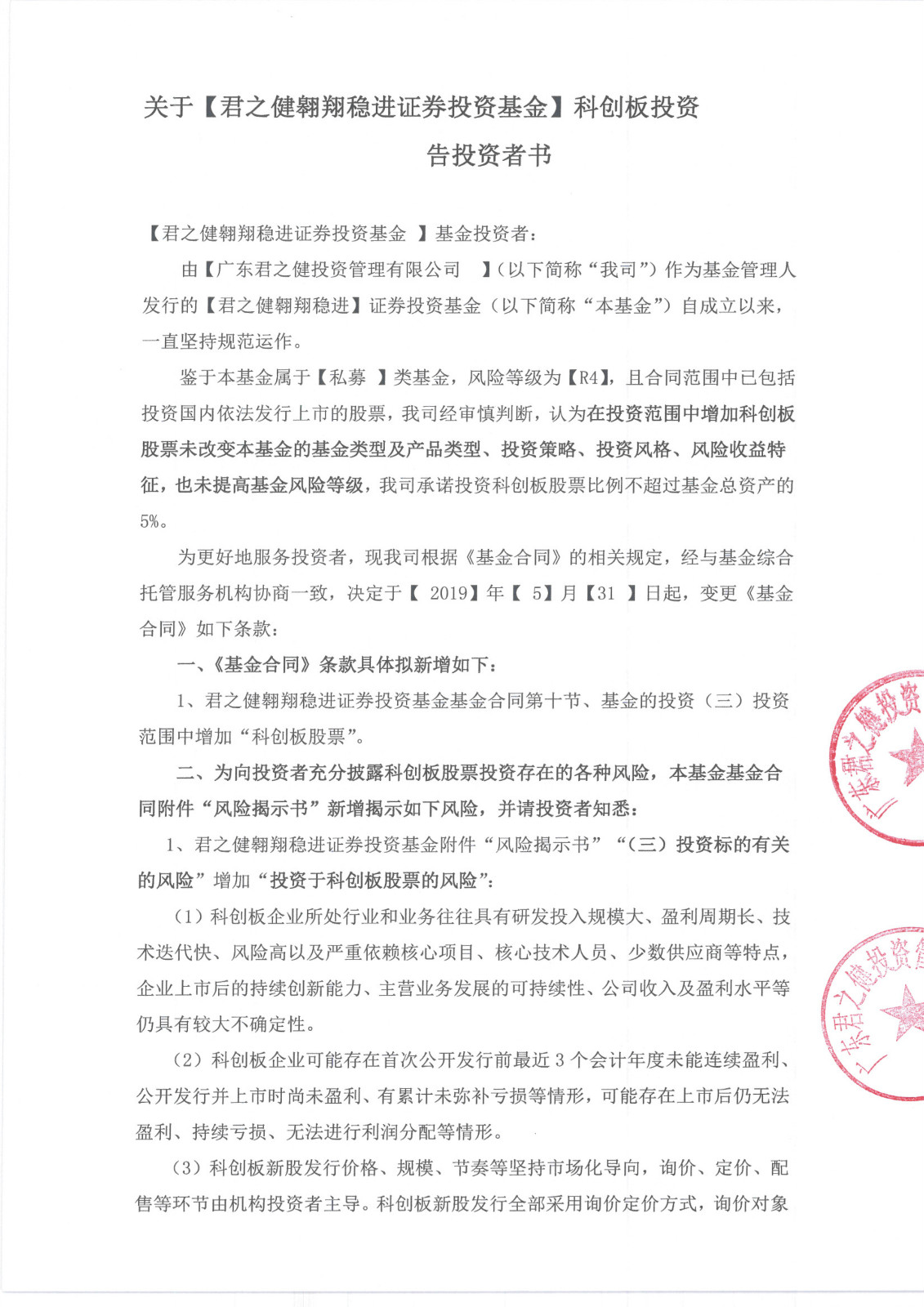 由【广东君之健投资管理有限公司 】(以下简称“我司”)作为基金管理人发行的【君之健翱翔稳进】证券投资基金(以下简称“本基金”)自成立以来,一直坚持规范运作。