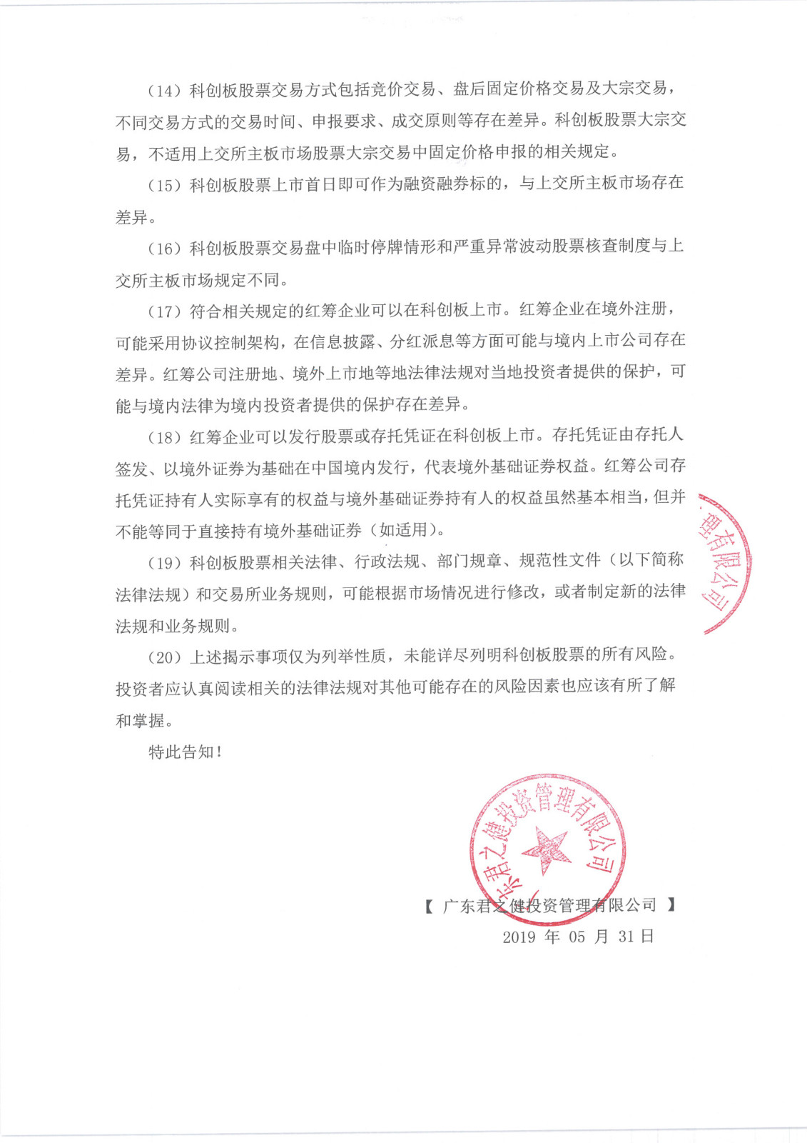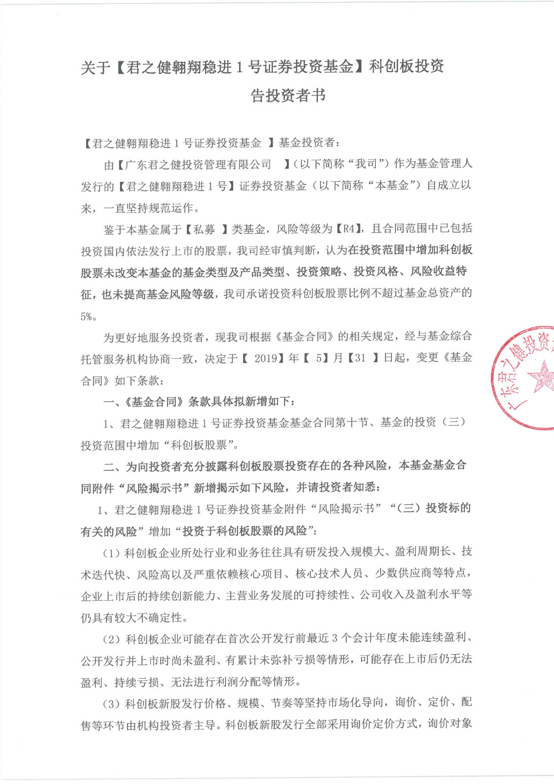 关于【君之健翱翔稳进1号证券投资基金】科创板投资 告投资者书