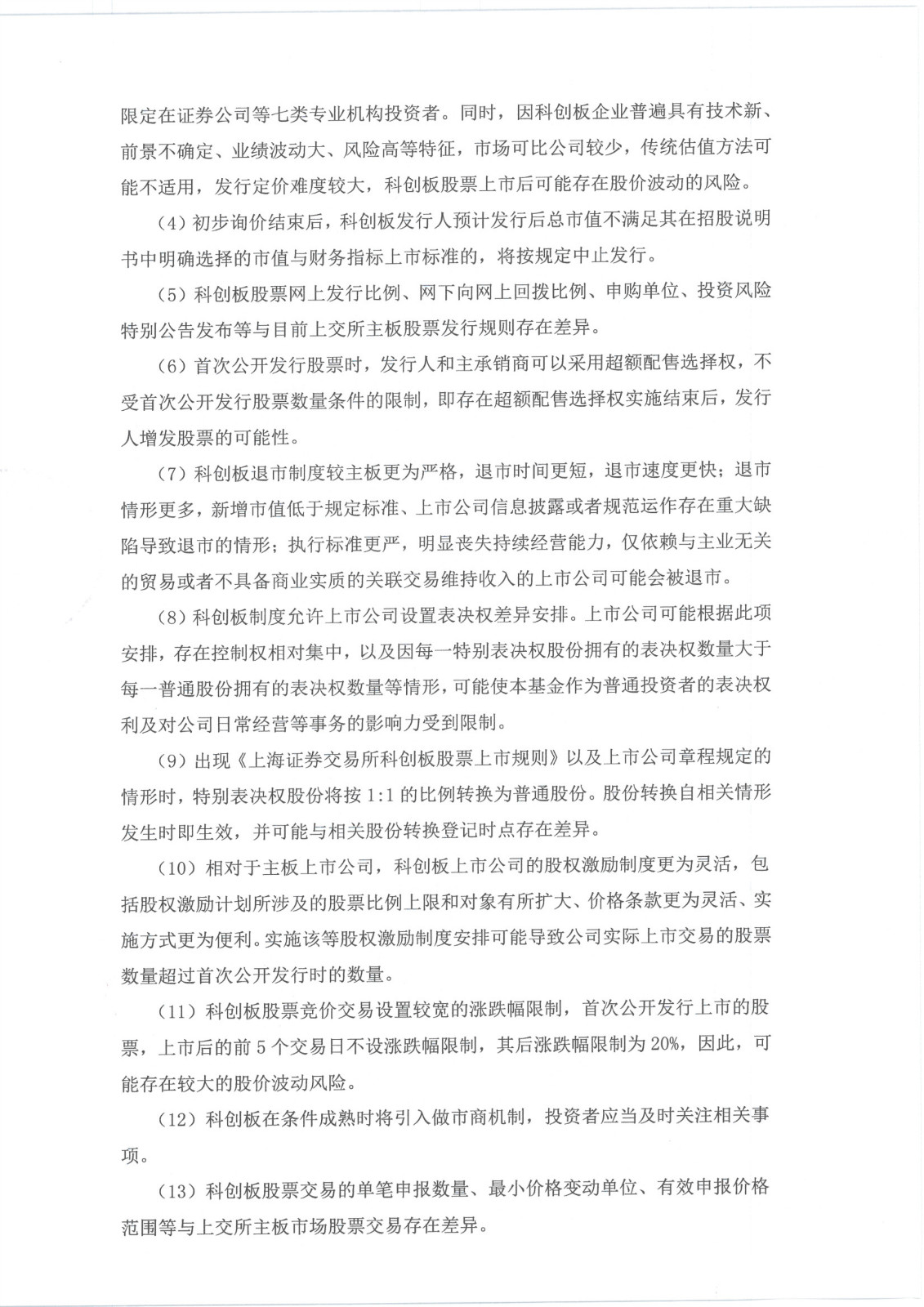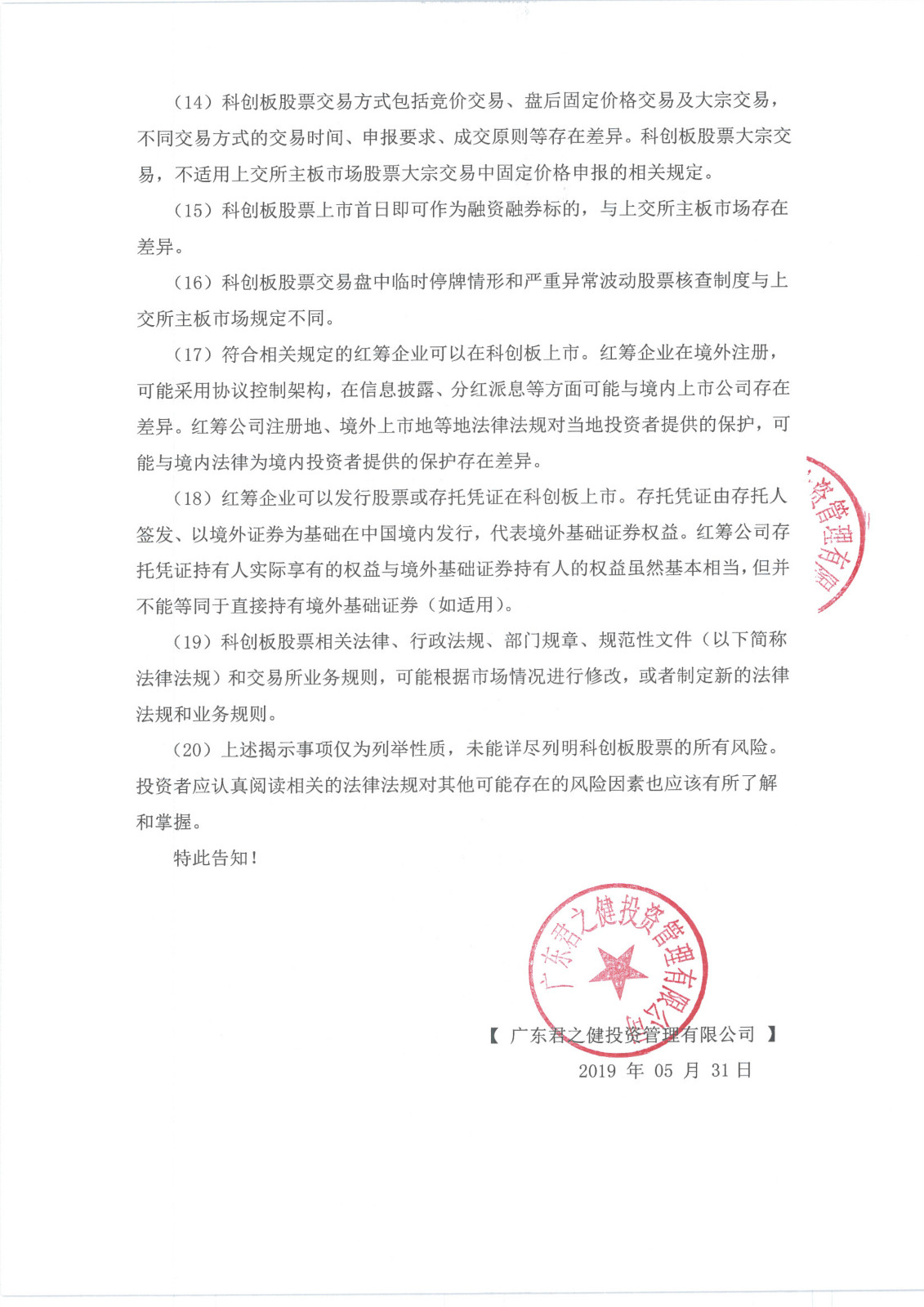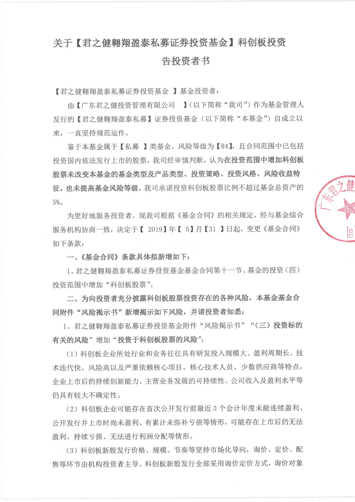 关于【君之健翱翔盈泰私募证券投资基金】科创板投资 告投资者书
