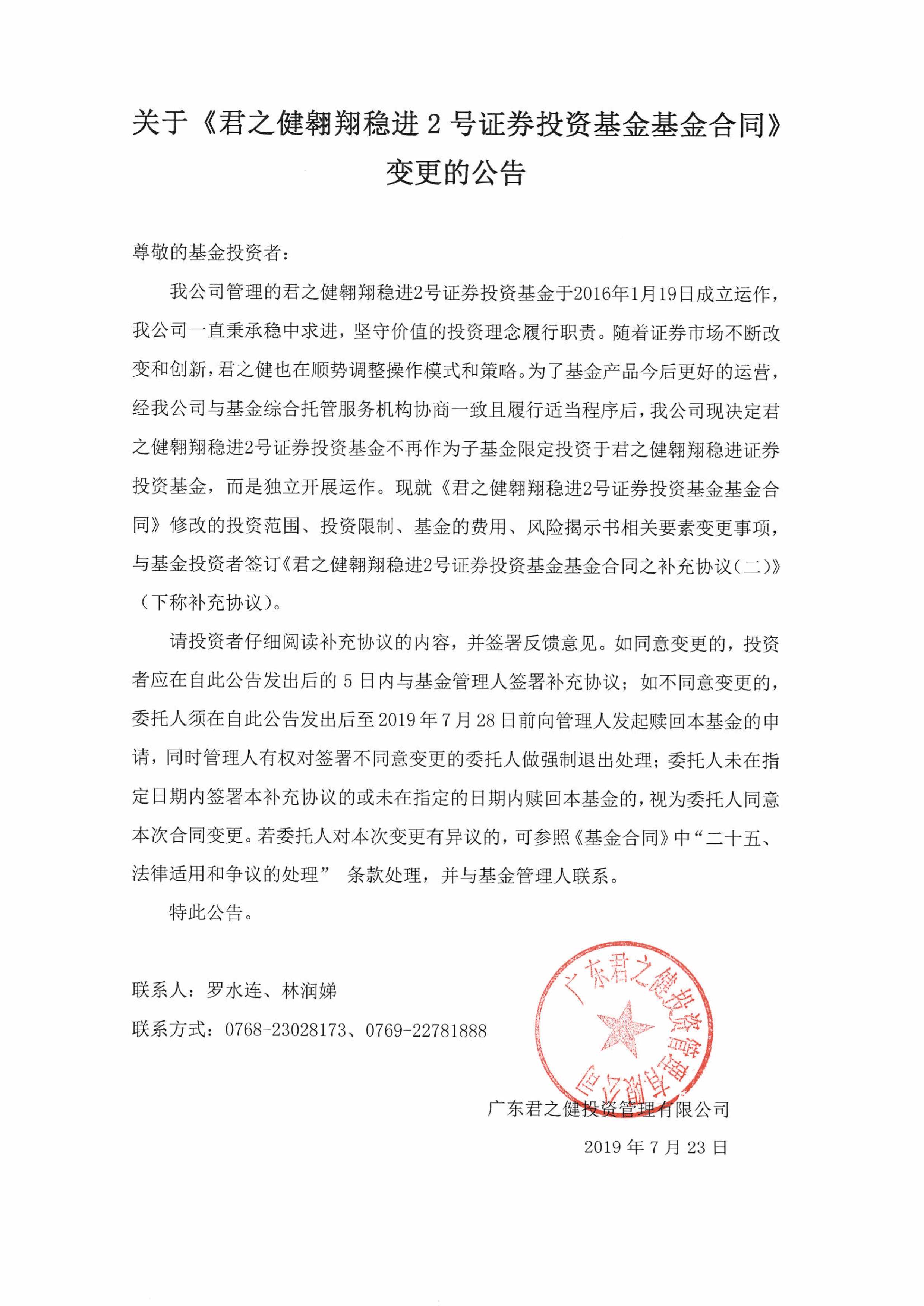 关于《君之健翱翔稳进2号证券投资基金基金合同》变更的公告