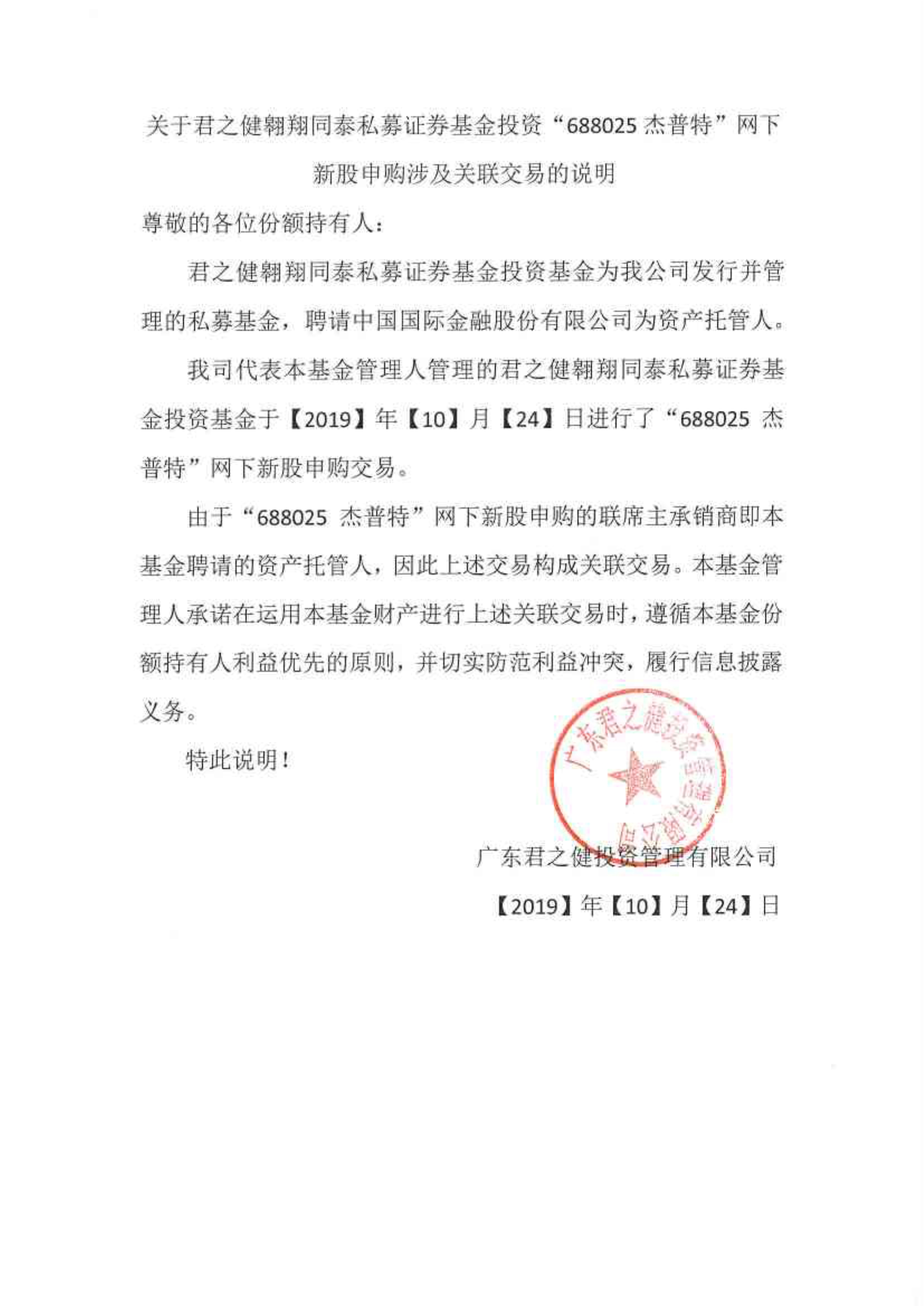 关于君之健翱翔同泰私募证券投资基金投资“688025杰普特”网下新股申购涉及关联交易的说明