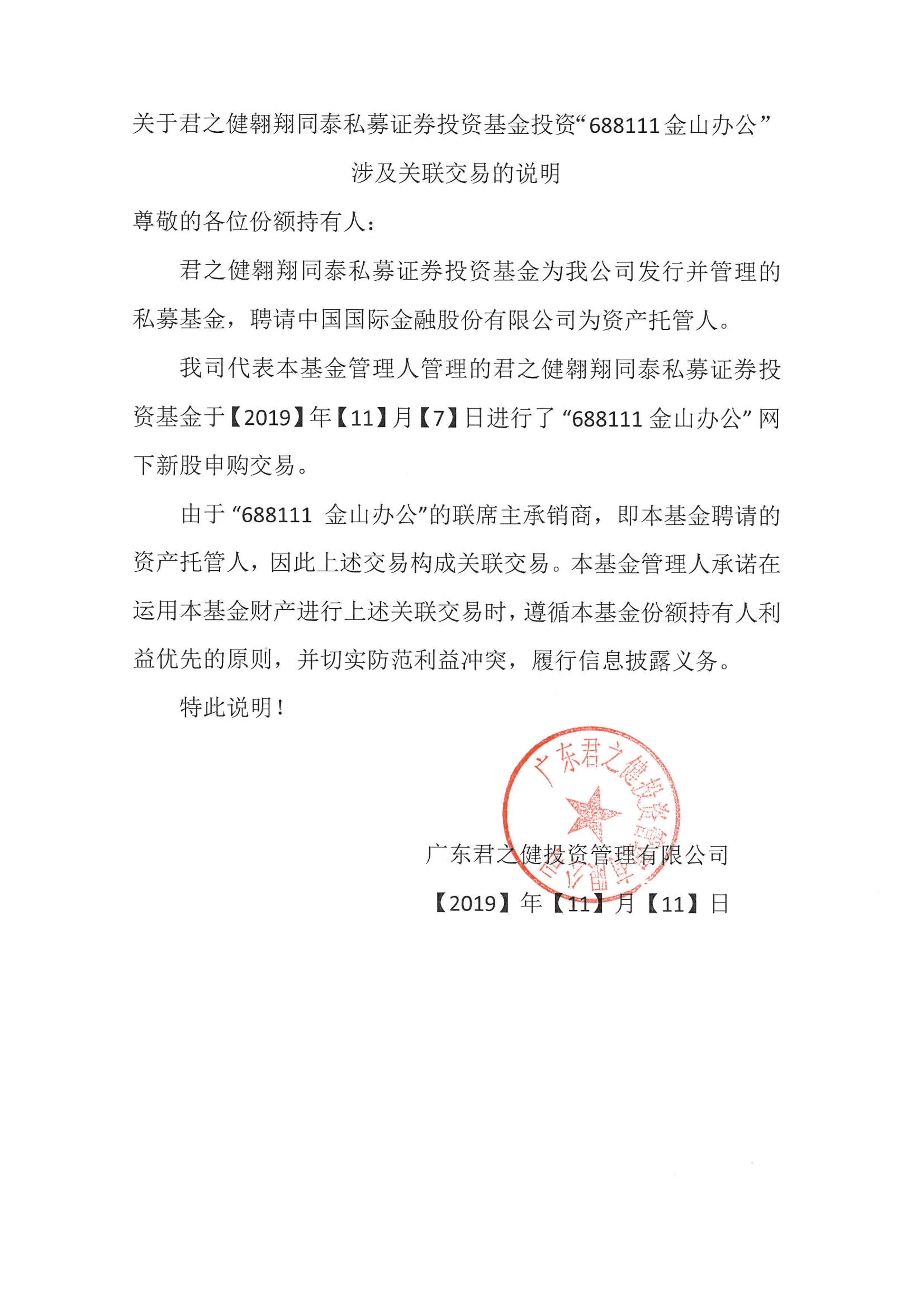 关于君之健翱翔同泰私募证券投资基金投资“688111金山办公”涉及关联交易的说明
