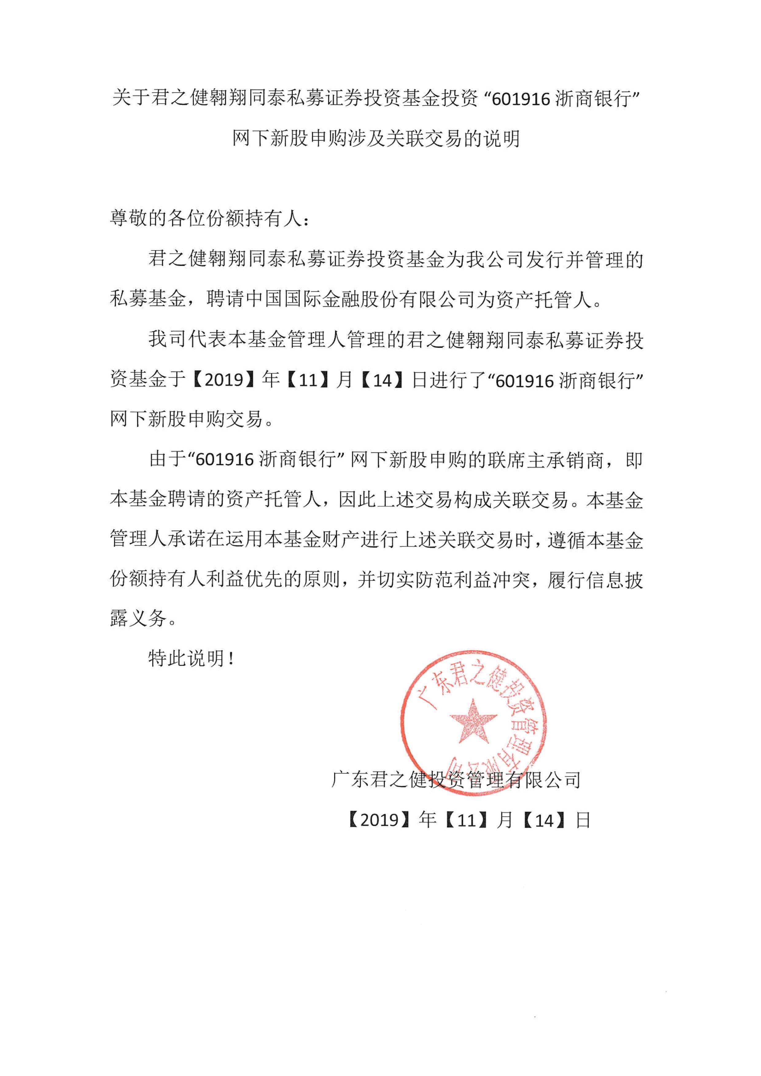关于君之健翱翔同泰私募证券投资基金投资 “601916 浙商银行” 网下新股申购涉及关联交易的说明