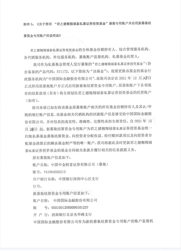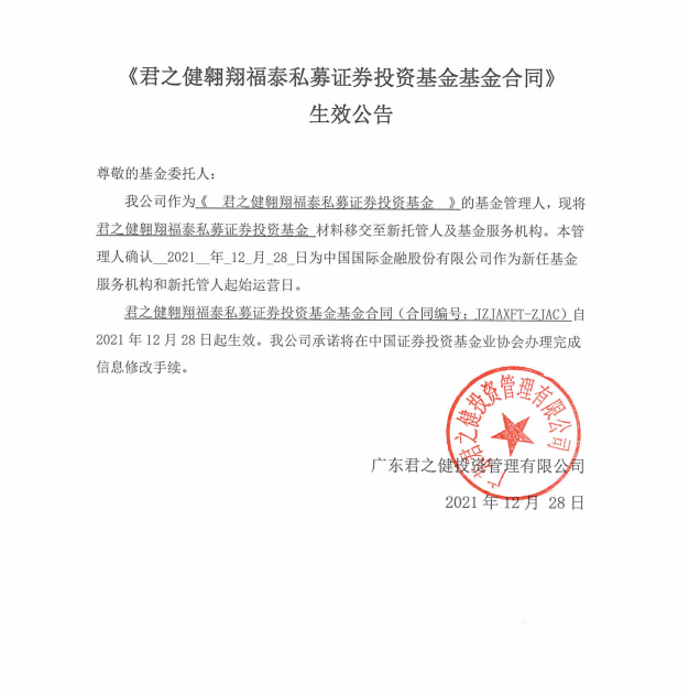 关于《君之健翱翔福泰私募证券投资基金基金合同》生效的公告